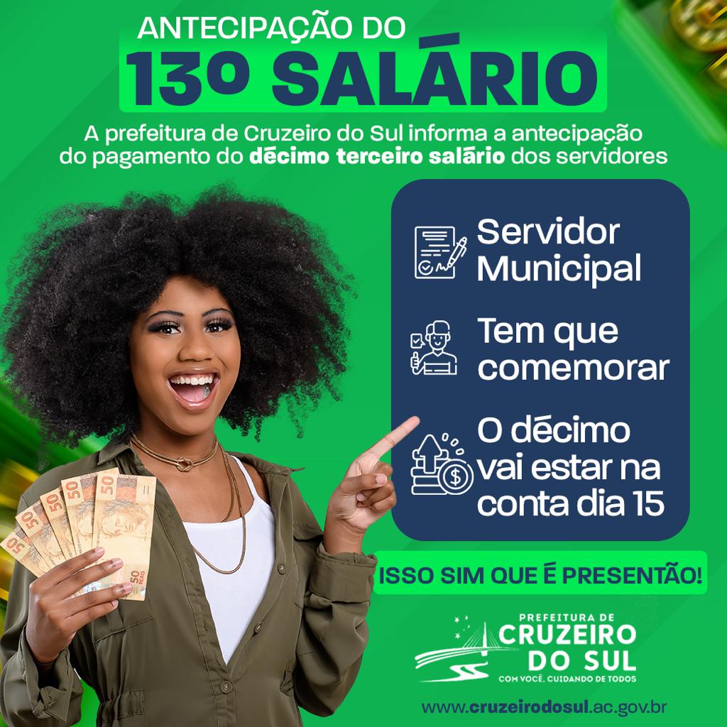 No clima do Natal, a prefeitura de Cruzeiro do Sul anunciou a antecipação do 13º salário dos seus servidores. A medida adotada tem como objetivo principal aquecer a economia local durante o período natalino.