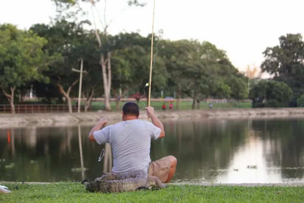 O amigo em questão se trata de um jacaré, que habita por aquela região, e é alimentado pelos peixes que Aldecino pesca no lago. Rosi Sabóia, uma das pessoas que passam diariamente pelos amigos, registrou o momento entre Aldecino e Tião e publicou nas redes sociais.