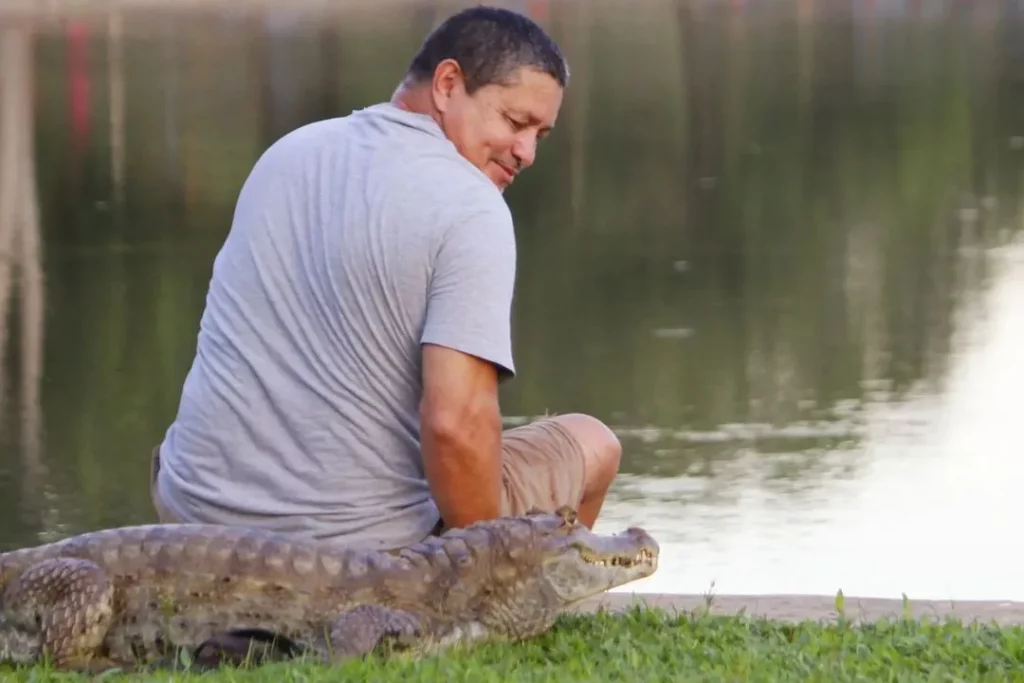 O amigo em questão se trata de um jacaré, que habita por aquela região, e é alimentado pelos peixes que Aldecino pesca no lago. Rosi Sabóia, uma das pessoas que passam diariamente pelos amigos, registrou o momento entre Aldecino e Tião e publicou nas redes sociais.