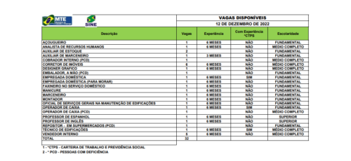 As vagas disponíveis são para açougueiro, analista de recursos humanos, auxiliar de estoque, auxiliar de marceneiro, cobrador interno (PCD), corretor de imóveis, designer gráfico, embalador a mão (PCD), empregada doméstica, empregada doméstica (para morar), faxineiro no serviço doméstica, manicure, marceneiro, montador, oficial de serviços gerais na manutenção de edificações, operador de caixa, operador de caixa (PCD), professor de espanhol, professor de inglês, repositor em supermercados (PCD), técnico de edificações e vendedor interno.