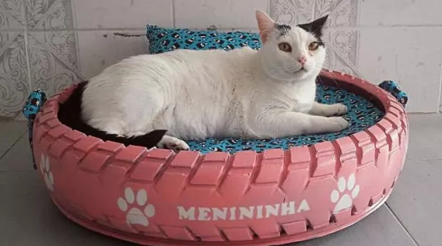 Ele transforma pneus velhos e descartados em camas para animais de rua.