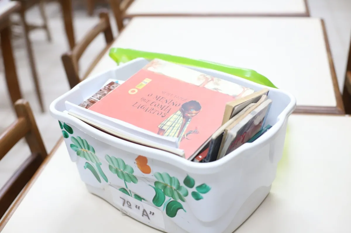 A escola também criou uma caixa de leitura com vários títulos de diferentes gêneros literários que é trazida à sala de aula uma vez por semana para turmas do 6º ao 9º ano.
