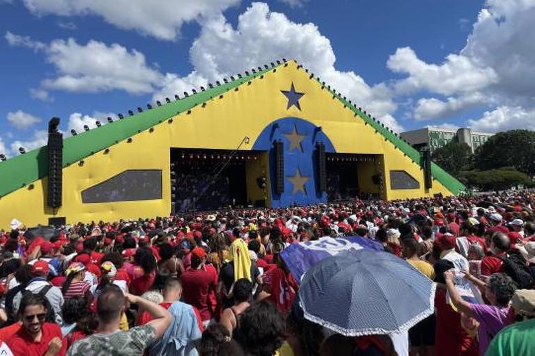 Com gritos de “Lula, Lula” e “fora, Bolsonaro”, apoiadores vibraram quando o carro do presidente passou na altura do palco. Até então, as pessoas aguardavam os shows e a cerimônia mais próximos de árvores e sombras, mas o público se adensou com bandeiras do PT, camisetas com o rosto de Lula e dizeres em apoio à democracia.