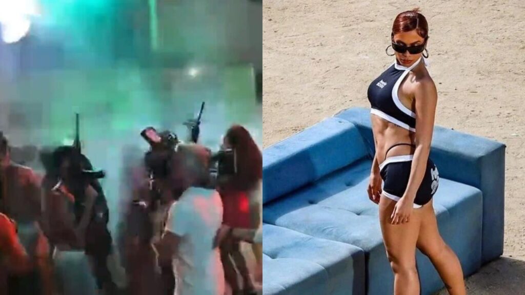Na cena, os integrantes da gravação do clipe da Anitta estão em uma festa, com várias pessoas dançando até o chão e, em meio a elas, aparecem aos homens armados em fileira com os fuzis na mão e dançando.