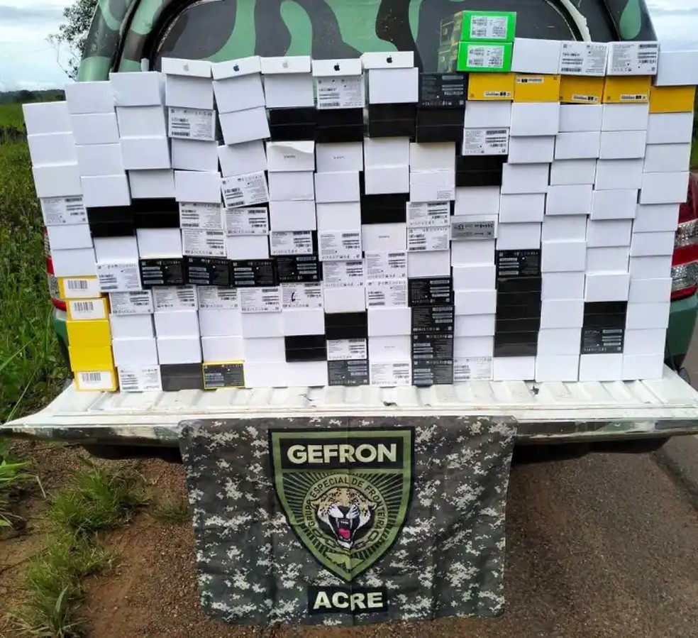 O Grupo Especial de Fronteira (Gefron) apreendeu 166 aparelhos celulares lacrados em caixas e sem nota fiscal durante uma abordagem a um veículo no km 28 da BR-317, próximo ao município de Xapuri, no interior do Acre. Um homem foi detido.