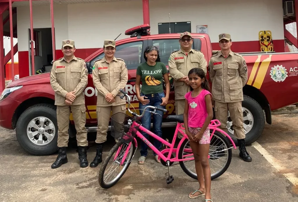 Nesta semana, militares do 8° Batalhão do Corpo de Bombeiros de Xapuri, doaram uma bicicleta nova para Camile dos Santos Leandro, de 9 anos, para que ela possa ir à escola. O presente foi um pedido especial da moradora do conjunto Armando Nogueira, também conhecido como Cidade Deus.