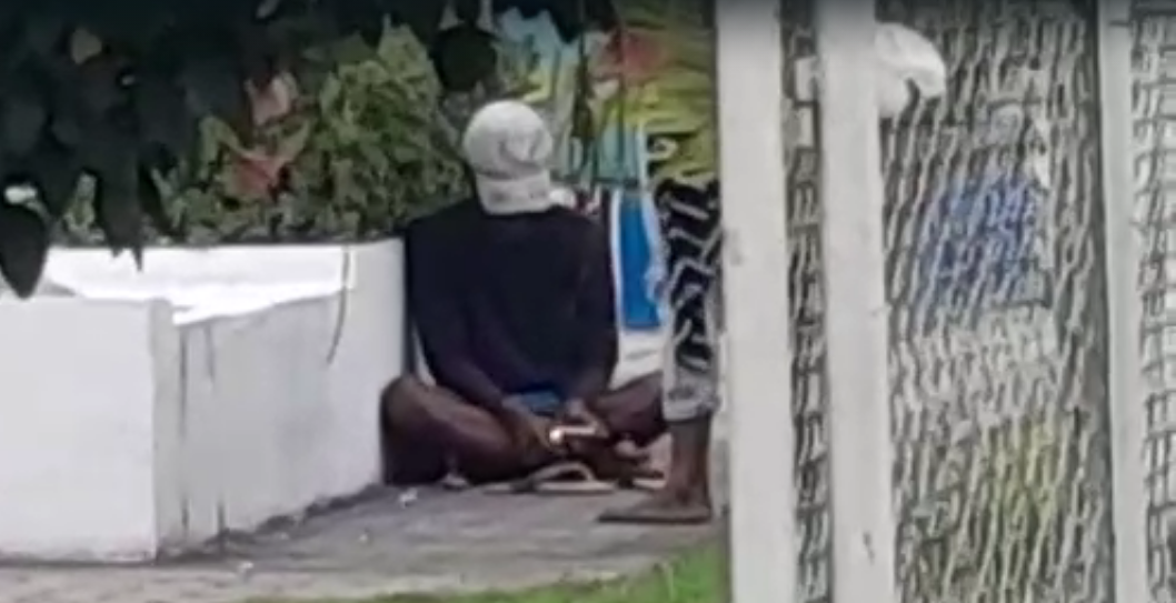 No vídeo do flagrante um homem aparece sentado no chão e parece estar fumando algo, logo em seguida, uma mulher, que estava sentada em um dos bancos da Praça, levanta e pede algo para o homem.