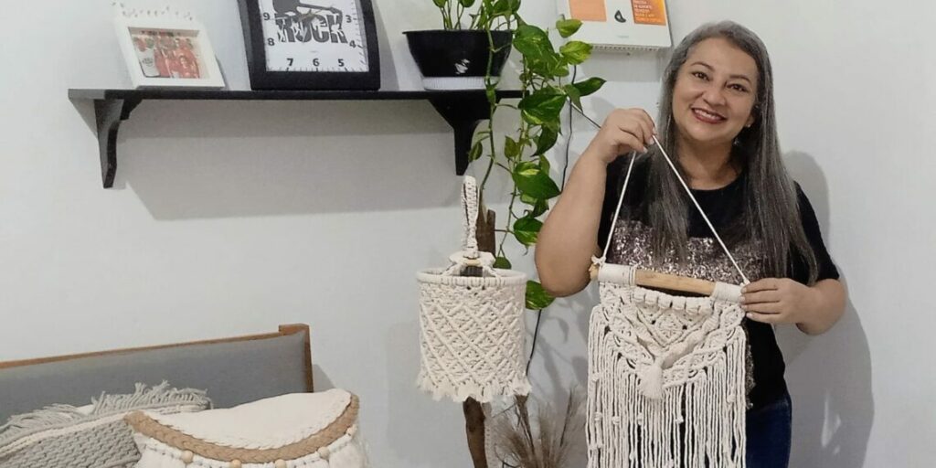 A funcionária pública Neide Lima, de 47 anos, moradora de Rio Branco, começou a produzir peças decorativas de macramê em 2021 após um problema de saúde que deixou suas mãos dormentes como sequela.