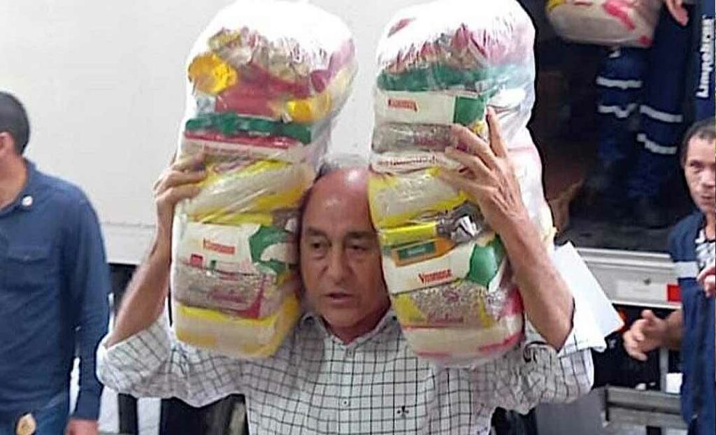 O prefeito de Rio Branco, Tião Bocalom, colocou a mão na massa após ser cobrado nas redes por sua ausência nas ajuda aos desabrigados pelas enchentes na capital. É o que mostra um vídeo gravado por servidores comissionados do Município. Nas imagens, Bocalom aparece carregando dois sacolões nos ombros entre um caminhão e a entrada da sede prefeitura, enquanto alguns funcionários da prefeitura gritam: “Arrocha, prefeito!”.