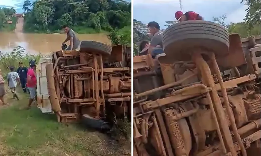 Caminhão boiadeiro tomba ao tentar subir rampa em Xapuri