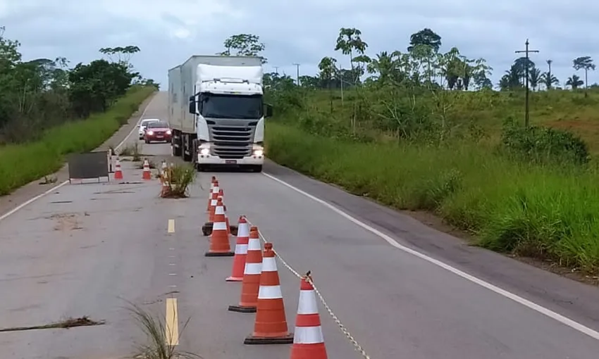Uma equipe do DNIT já está trabalhando no local. A rodovia teve o tráfego bloqueado no domingo (19), após as fortes chuvas provocarem o rompimento de um bueiro.