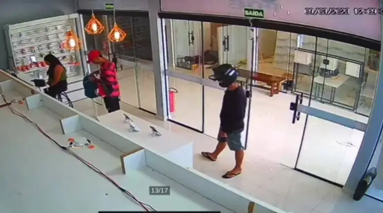 As câmeras de segurança do local gravaram o momento em que dois homens entram na loja com uma mochila e começam a colocar os aparelhos na bolsa.