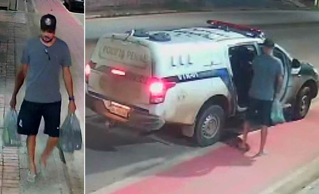 O servidor que está de bermuda e aparentando estar fardado, acomoda as bebidas no banco traseiro da viatura. Acompanhe às imagens.
