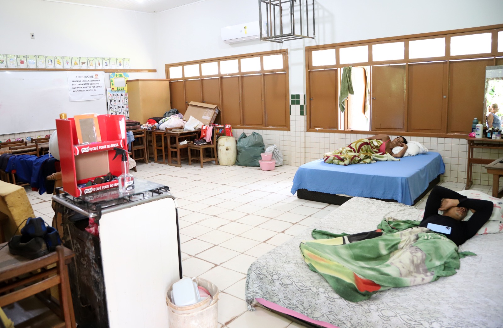 A Escola João Paulo II, localizada no Bairro Sobral, recebeu 12 famílias do bairro Ayrton Senna, um total de 48 pessoas, distribuídas em 10 salas de aula.
