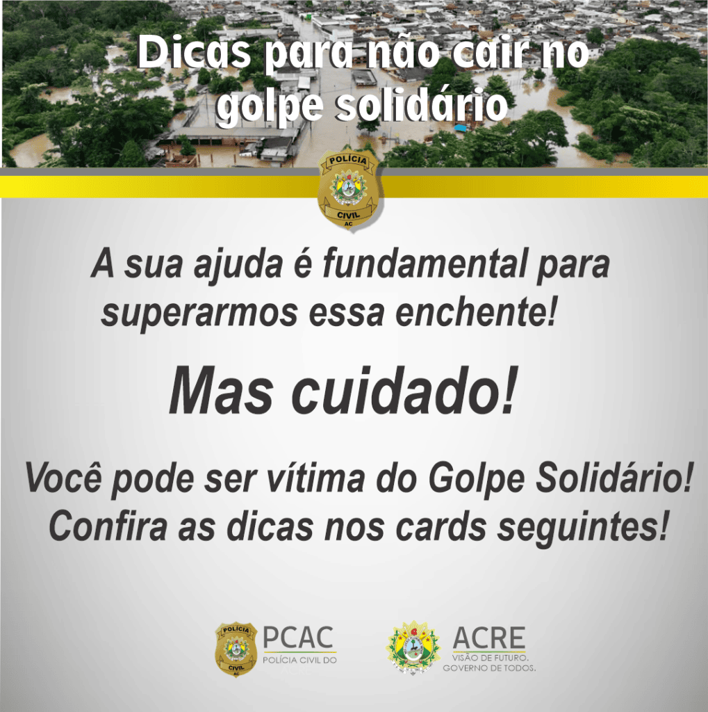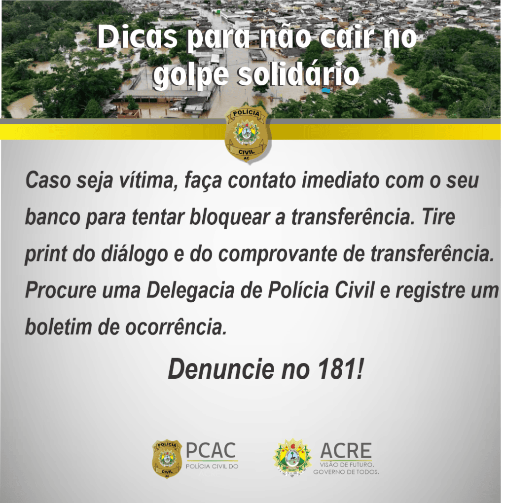 A Polícia Civil do Acre orienta a população que deseja realizar algum tipo de ajuda a tomar cuidado para não cair em golpes. Antes de realizar donativos, deve-se atentar para a idoneidade e procedência dos órgãos que estão realizando a campanha.