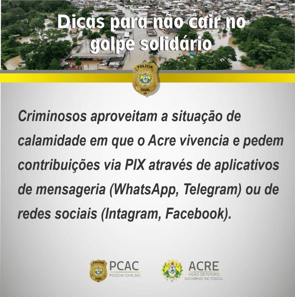 Neste momento de calamidade pública provocada pelas enchentes dos rios e igarapés acreanos, muitas pessoas criam campanhas nas redes sociais para arrecadar alimentos, roupas, colchões, produtos de limpeza e até dinheiro para ajudar quem perdeu tudo na alagação. Mas, em meio a ações legítimas de solidariedade, malfeitores se aproveitam da situação e, por meio de aplicativos de mensagens, pedem transferência de dinheiro via Pix, alegando auxílio a terceiros.