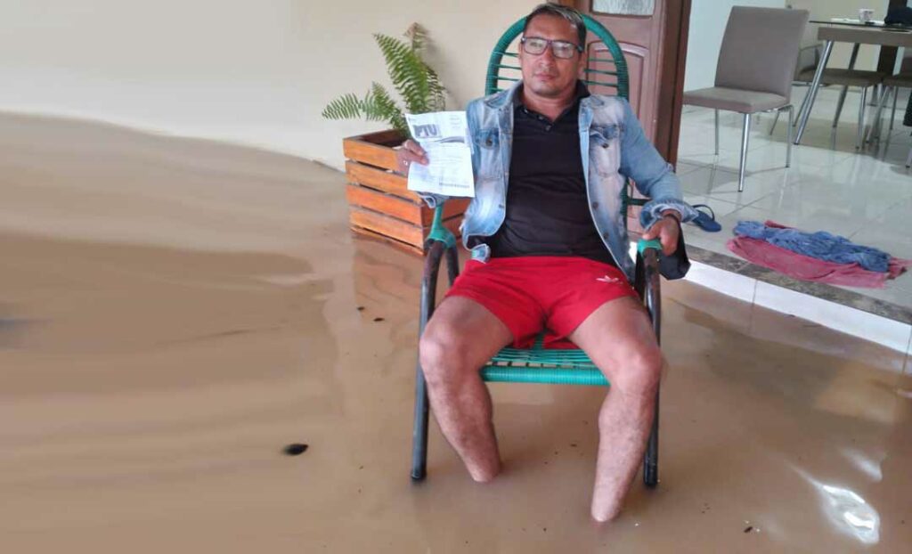 “Essa é a Rua Liberdade, na Sobral, agora que Liberdade? Simplismente eu estou vendo o meu dinheiro indo para o ralo, um absurdo. Prefeito, os esgotos aqui da rua estão todos entupidos. O senhor falou em campanha que ‘se não roubar, dá de fazer’, mas o que está acontecendo que não está fazendo? Olha aqui a situação!”, diz o morador mostrando a casa invadida pelas águas.