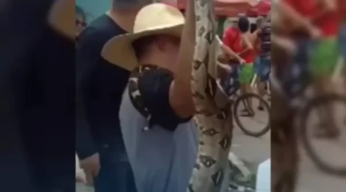 Um morador do bairro Aeroporto Velho, próximo a estrada da Sobral, aparece em um vídeo segurando uma jiboia de mais ou menos 2 metros de comprimento. Ele carrega o animal ainda vivo nos ombros. Em época de cheia dos rios e igarapés é comum que bichos como este apareçam em residências, ruas e bueiros.