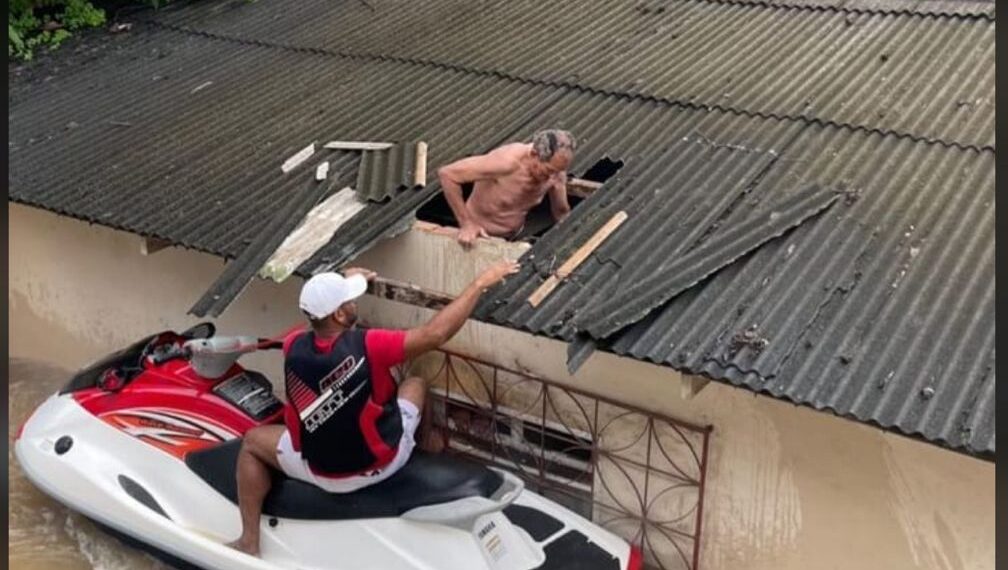 No registro, feito na manhã desta sexta-feira, 24, um idoso precisou ser resgatado por uma abertura feita no telhado de sua casa, que ficou totalmente tomada pelas águas do igarapé São Francisco.
