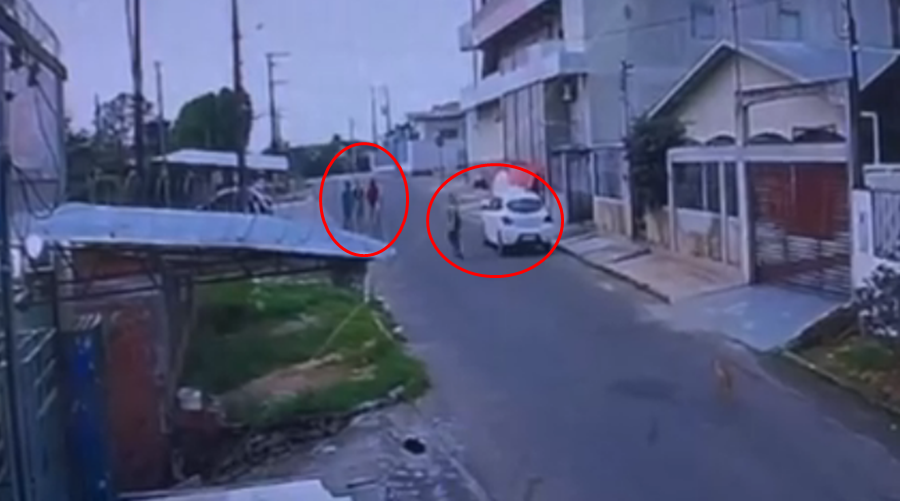 Nas imagens registradas por uma câmera de segurança das redondezas, é possível ver quando a mulher estaciona um carro modelo Ônix na cor branca, e três indivíduos se aproximam dela, anunciando o assalto.