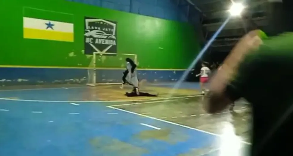 Bola rolando na quadra e um dos times troca passes. Segundos depois, a bola entra em disputa, e uma das jogadoras leva vantagem e segue em velocidade rumo ao gol. Ela carrega a bola por cerca de 20 metros e marca um golaço abençoado.