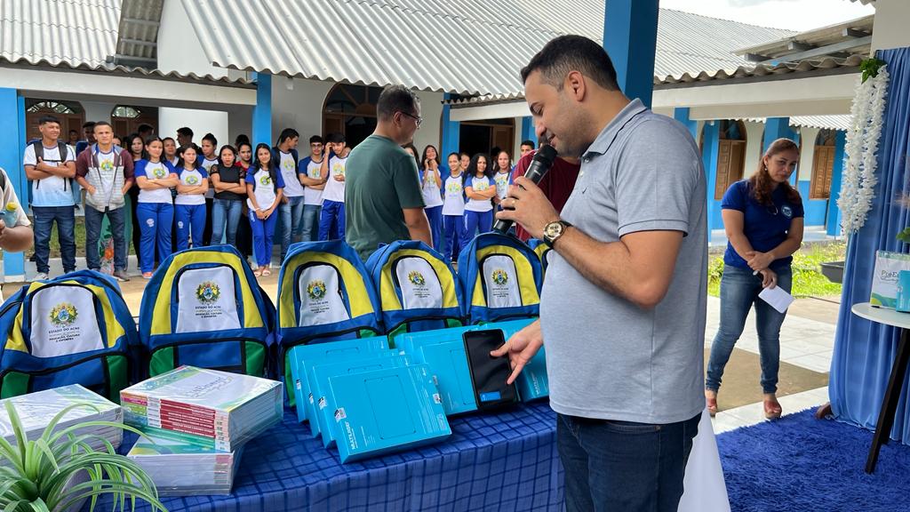 Na manhã desta quinta-feira (27), o Secretário Estadual de Educação Aberson Carvalho, acompanhado do deputado estadual Nicolau Júnior em cumprimento da agenda, realizaram a entrega de kits escolares e kits de materiais do pré-Enem, além de tablets, para os estudantes da Escola Elvira Ferreira Gomes, em Marechal Thaumaturgo.