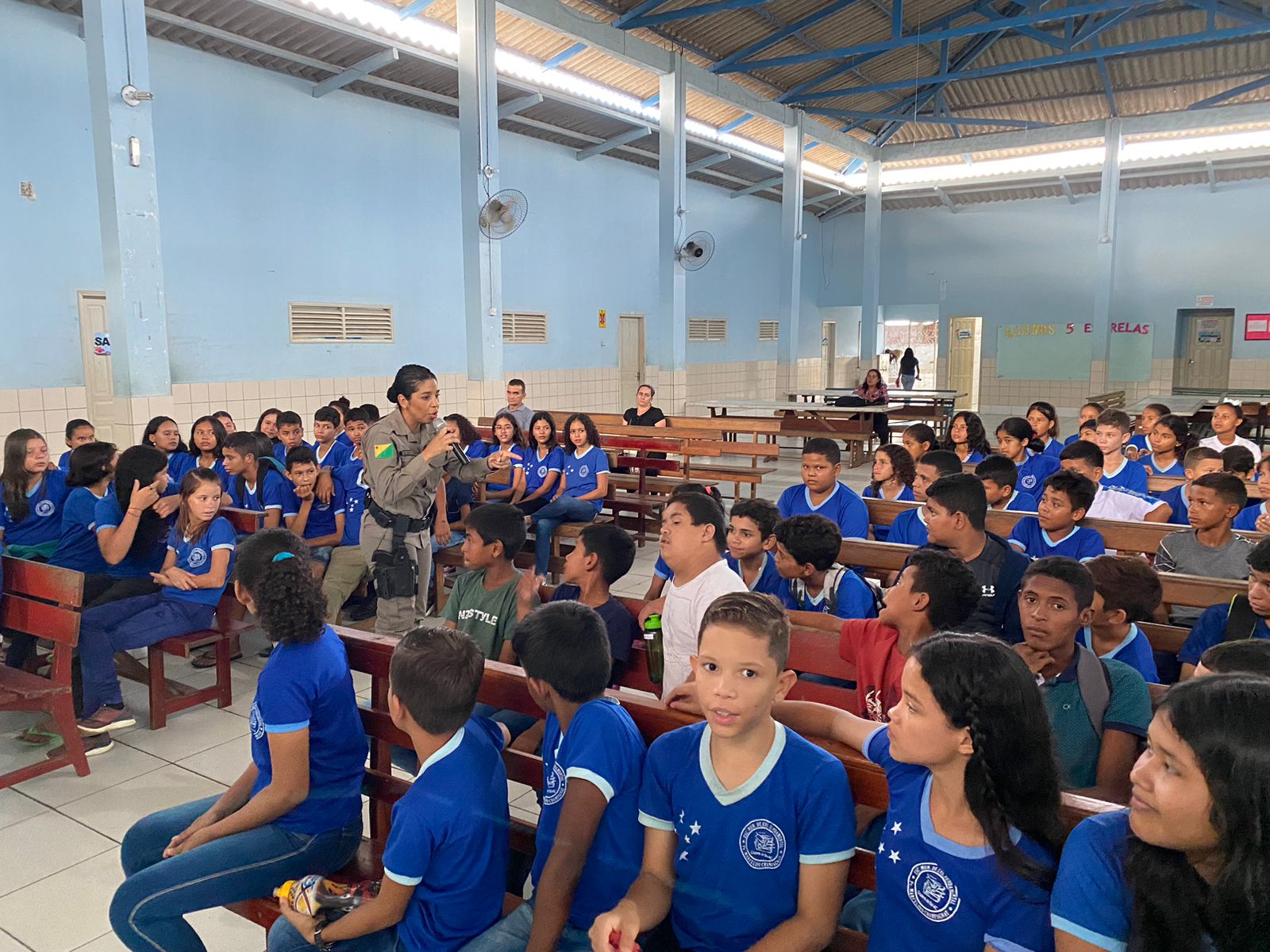 Nesta terça-feira (25), a Polícia Militar em Cruzeiro do Sul, através do Policiamento Escolar, realizou uma palestra na escola Padre Marcelino Champagnat com o tema Indisciplina e Direitos e Deveres do Aluno.