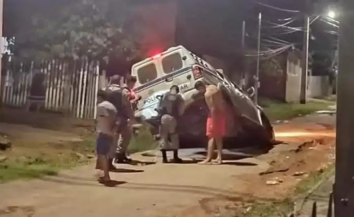 Uma viatura do 1° Batalhão da Polícia Militar do Acre acabou ficando presa após cair dentro de um bueiro, na noite desta segunda-feira (10) na Rua Adalberto Sena, no bairro Plácido de Castro, na região da Baixada da Sobral, em Rio Branco.