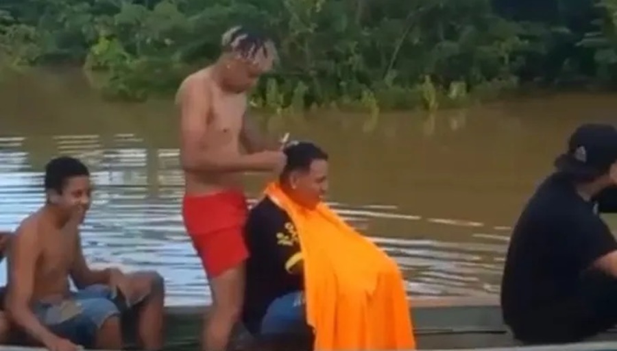 No vídeo que viralizou, Diego faz o atendimento dentro de uma canoa, enquanto três amigos remam em uma área atingida pela cheia. “À domicílio agora”, disse o barbeiro.