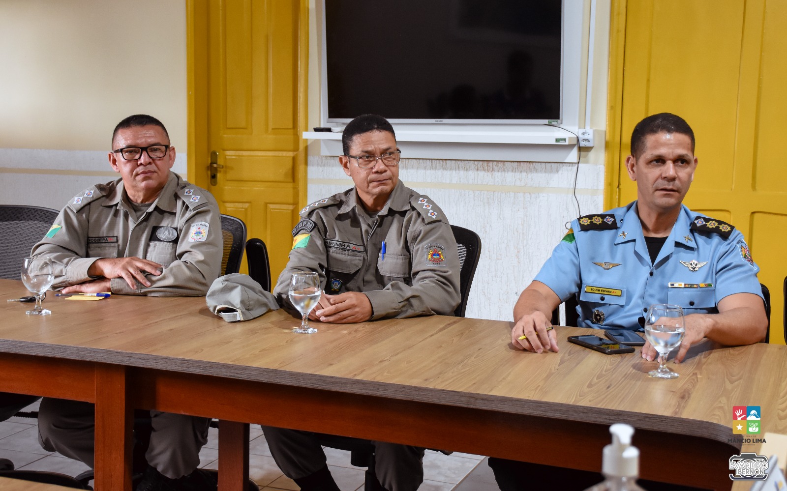 Estiveram na reunião o prefeito Isaac Lima, secretários e assessores, o comandante do 6° BPM TC Edvan, o Capitão Birimba e o comandante do 1° PEL (Mâncio Lima) Tenente Nogueira.