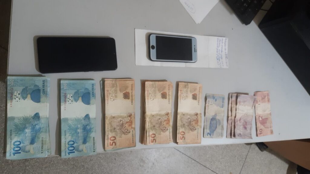 Ao chegarem, os policiais avistaram os supostos autores. Um deles estava com R$4.950,00 no bolso que, segundo ele, teria sido de extorsão (cobrança de “caixinha”) dos comerciantes para a facção Comando Vermelho. O segundo abordado tinha R$51,00 e uma lista com o nome de comércios e quanto deveria ser cobrado.