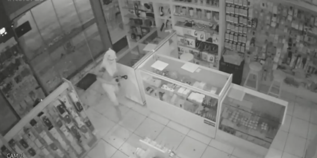 No vídeo mostra o momento em que os ladrões quebram o vidro da loja, invadem e começam a pegar produtos. Os dois estão com os rostos cobertos.