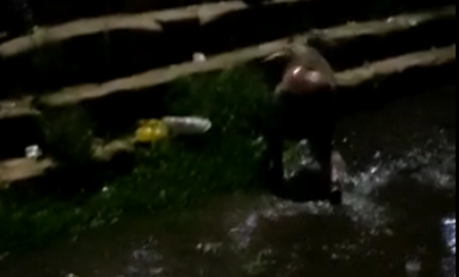 As imagens mostram um homem, aparentemente, alcoolizado, caindo dentro do córrego Boulevard Thaumaturgo. Muitas pessoas andam perto da água e algumas chegam a se assustar com o homem que sai do córrego cambaleando.
