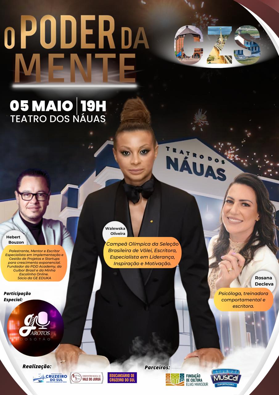 O evento “O poder da mente” será gratuito para todos os públicos e acontecerá no dia 05 de maio, no Teatro dos Náuas, às 19h. Terá realização da Prefeitura Municipal, do Conservatório Musical do Juruá e do Educandário de Cruzeiro do Sul.