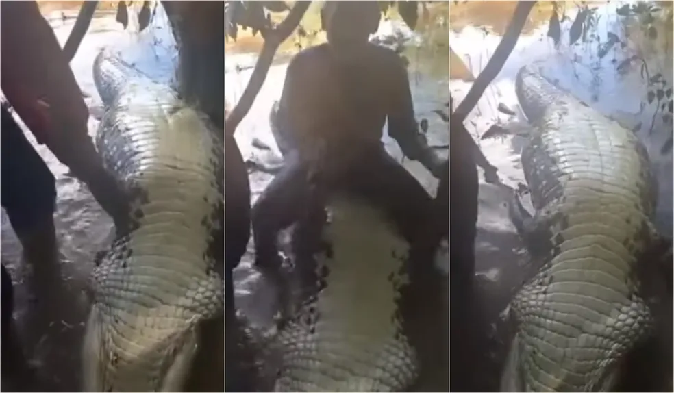 O vídeo da pesca do jacaré viralizou nesta quarta-feira (10). Nas imagens, os pescadores se gabam do ato. Um dos homens chega a montar em cima do animal morto e dar risada da situação.
