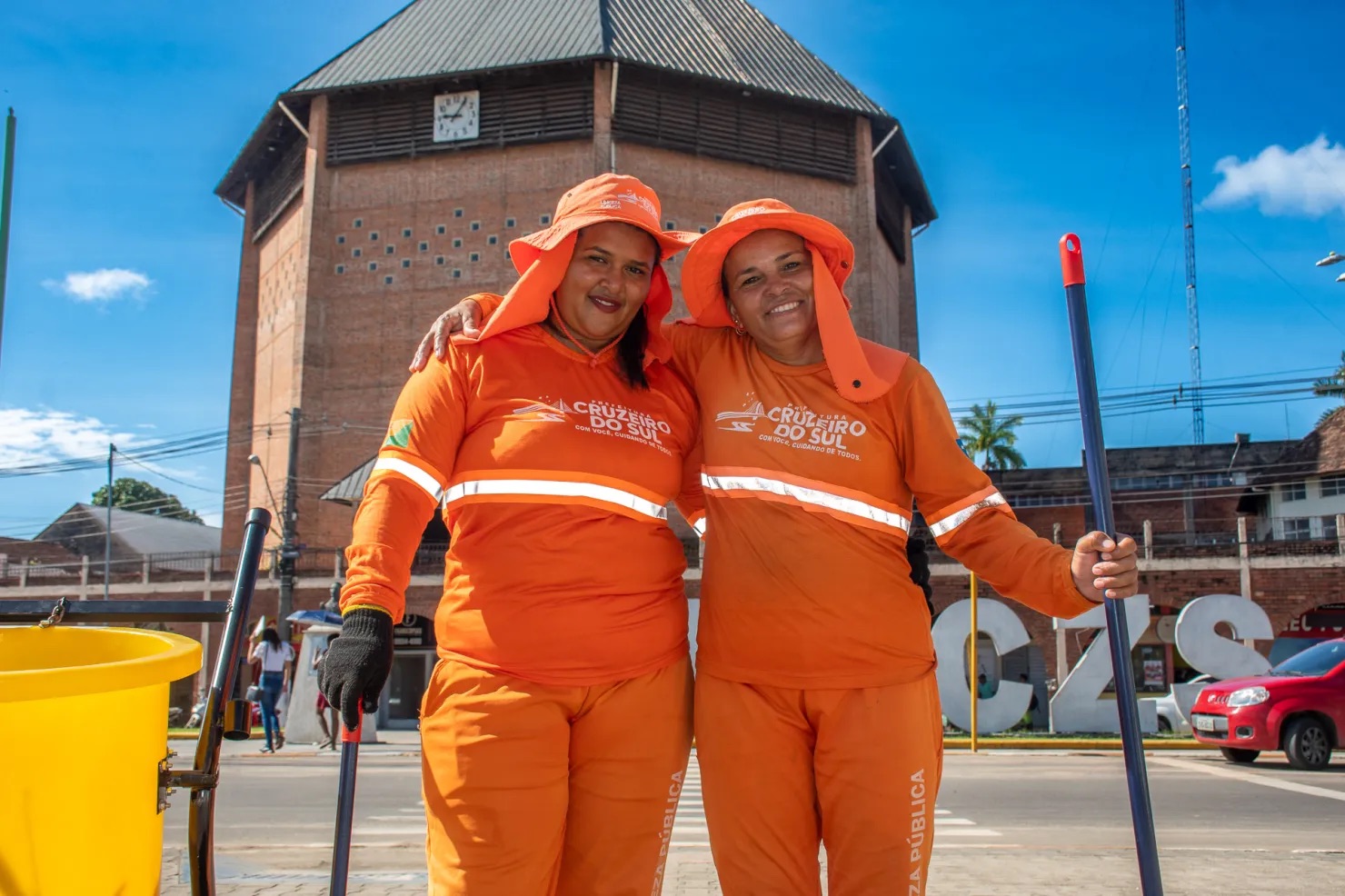 É na frente da Catedral Nossa Senhora da Glória, em Cruzeiro do Sul, que mãe e filha margaridas, começam a rota de trabalho. Dona Maria José Nascimento Rodrigues, conhecida por Xuita, 50 anos, e a filha Eveli Rodrigues da Silva, de 29 anos, atuam há 5 anos na limpeza da cidade. Uma não desgruda da outra e elas se ajudam no ofício, que consideram dos mais dignos.