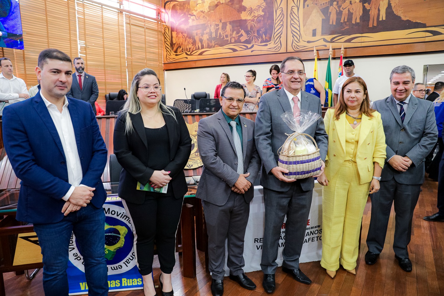 Reynaldo Fonseca foi ao centro do Plenário onde recebeu das mãos dos parlamentares uma cesta com produtos regionais. Ele agradeceu pela receptividade e se prontificou em contribuir com a causa.