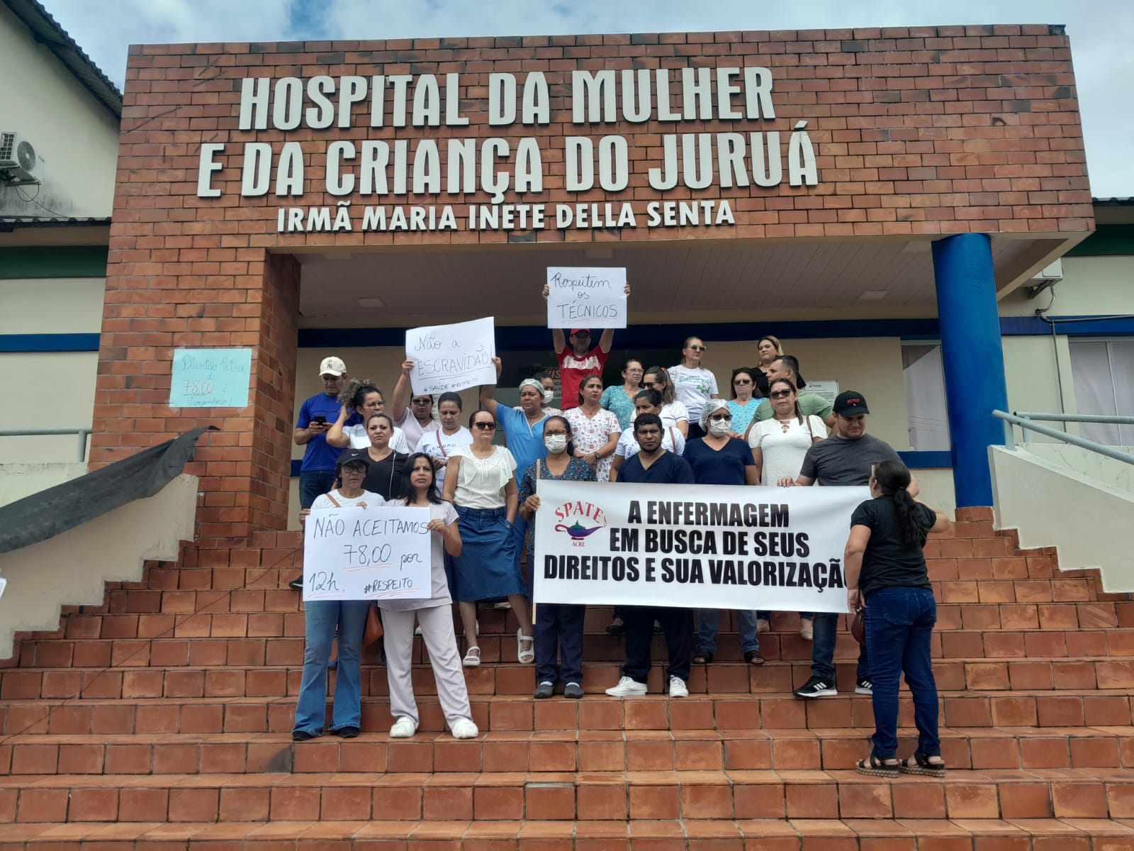 Na manhã desta sexta-feira (05), os técnicos de enfermagem se reuniram no Hospital da Mulher e da Criança do Juruá, em Cruzeiro do Sul, para realizar uma paralização, visando, de acordo com o cartaz que carregam, “seus direitos e sua valorização”.