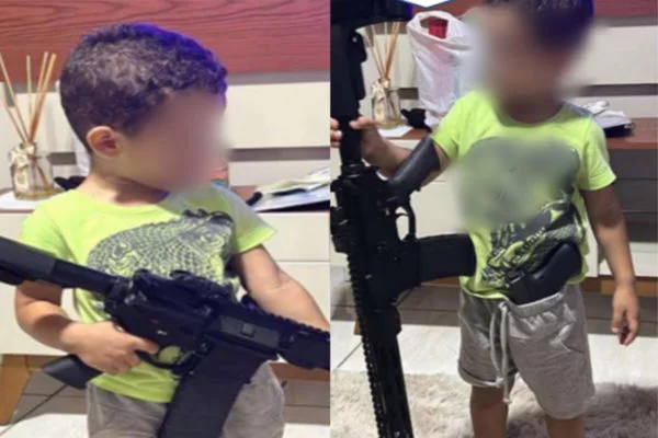 Um criminoso apontado como o segundo em comando de uma quadrilha que disputa pontos de venda de drogas com o Primeiro Comando da Capital (PCC) no interior de São Paulo obrigou seu filho de apenas 4 anos a posar para fotos ostentando armas de fogo, como fuzil. As imagens, que foram anexadas a uma denúncia do Ministério Público de São Paulo (MPSP), mostram o garoto segurando um fuzil enquanto carrega uma pistola em sua cintura. Em outra foto, ele está ao lado de uma arma de tamanho semelhante ao dele. A informação é do site Metrópoles.
