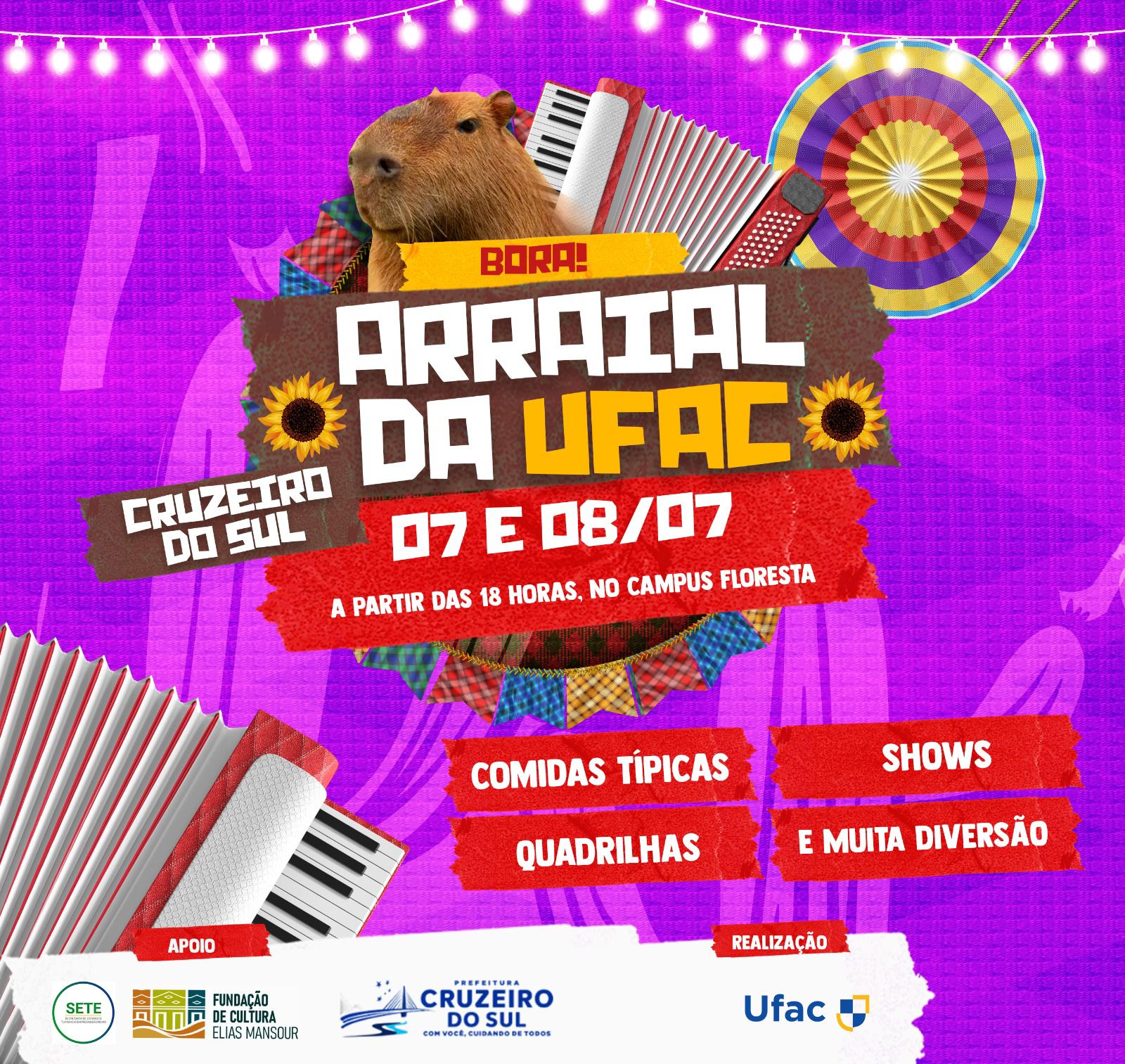 A Ufac realizará o tradicional Arraial da Ufac no Campus Floresta em Cruzeiro do Sul, pela Pró-Reitoria de Assuntos Estudantis (Proaes) e Atléticas do Campus Floresta. O evento ocorrerá nos dias 07 e 08 de julho, a partir das 18h, no Campus Floresta.