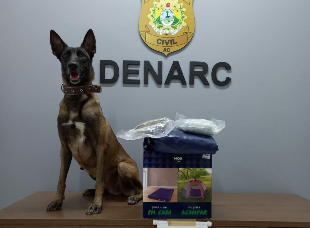 Na tarde da última terça-feira, 13, agentes da Delegacia de Repressão ao Narcotráfico (DENARC), com o apoio do Núcleo de Operações com Cães da Polícia Civil do Acre (NOC), apreenderam dois tabletes de entorpecentes, ambos pesando cerca de dois quilos, que estavam escondidos em embalagem de um colchão inflável, no pátio de despacho de cargas do Correio, em Rio Branco.