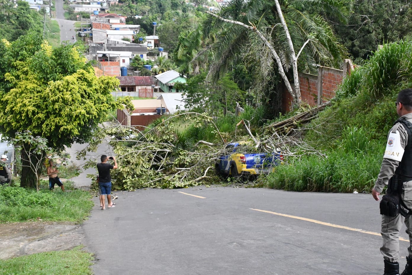 Uma árvore caiu e atingiu uma caminhonete da Secretaria Municipal de Mobilidade e Trânsito (SEMTRANS), na tarde deste sábado (03), no bairro 25 de Agosto.