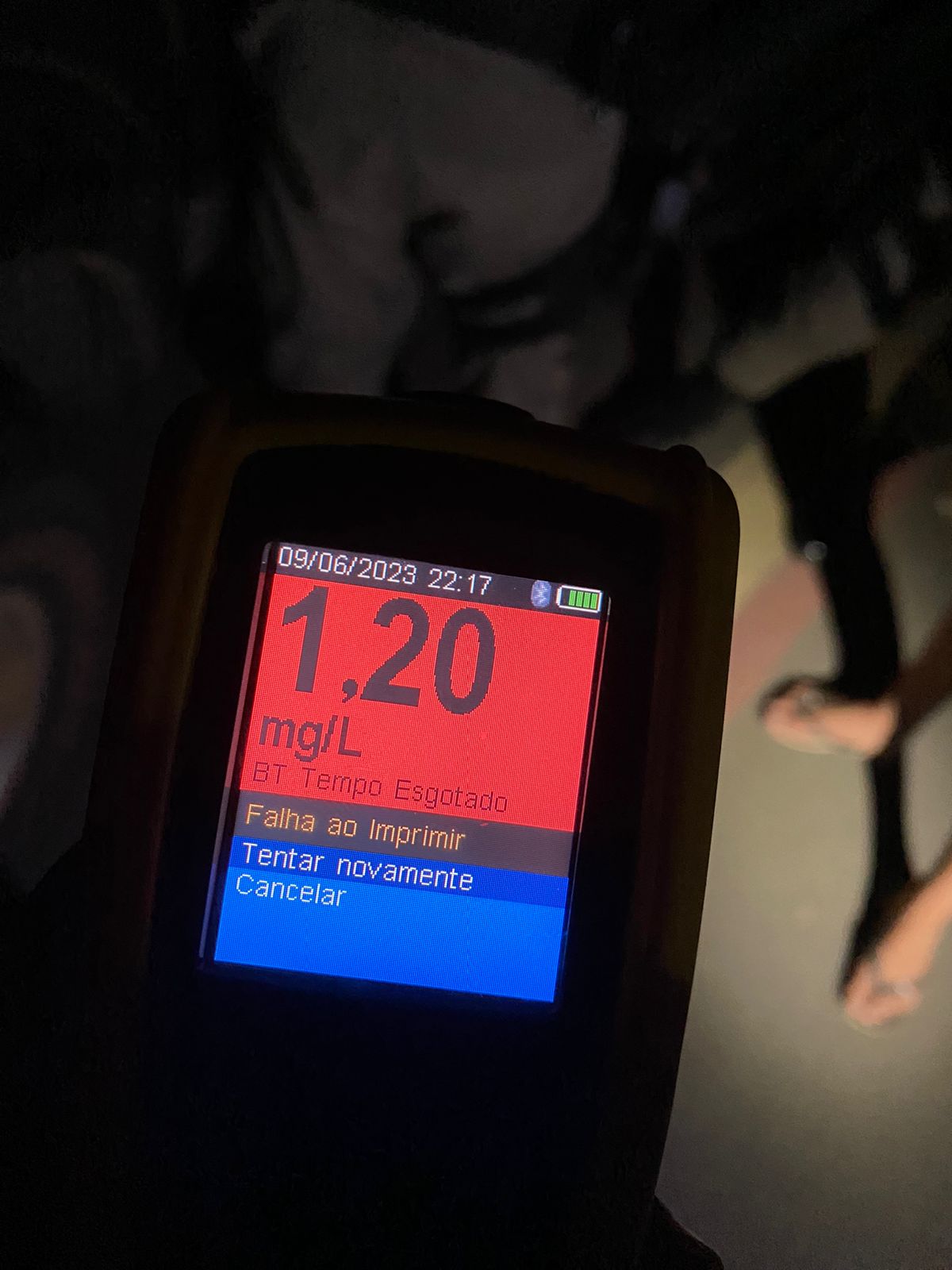 Durante abordagem, o indivíduo afirmou ter ingerido bebida alcoólica, visto que apresentava sinais de embriaguez como forte odor alcoólico, olhos vermelhos, sonolência, dispersão, dificuldade de equilíbrio e falta de coordenação motora. Após a realização do teste de etilômetro, o resultado aferido foi de 1,20 mg/L.