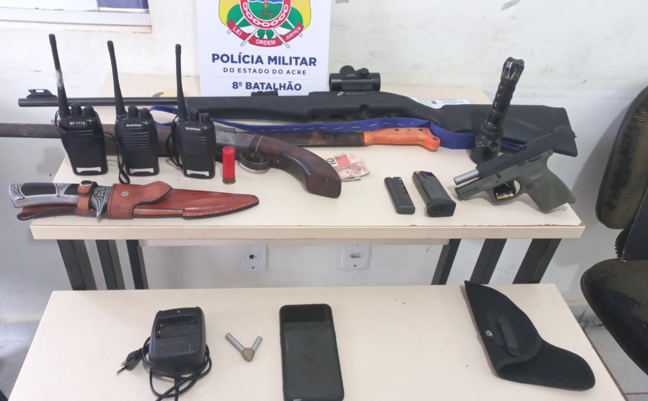 Diante das informações, as guarnições realizaram diligências e conseguiram realizar abordagem a um veículo que estava em deslocamento sentido Sena Madureira ocupado pelos quatro suspeitos. Durante as buscas os objetos roubados foram localizados, além de uma arma de fogo, tipo escopeta, calibre 16 com uma munição, além de três rádios comunicadores.