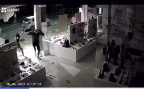 Nas imagens registradas pelas câmeras de segurança, é possível ver a dupla criminosa usando a força para quebrar a porta de vidro, que se estilhaça ao chão. O alarme soa, mas isso não inibe a ação, os homens pegam alguns sapatos e saem correndo.