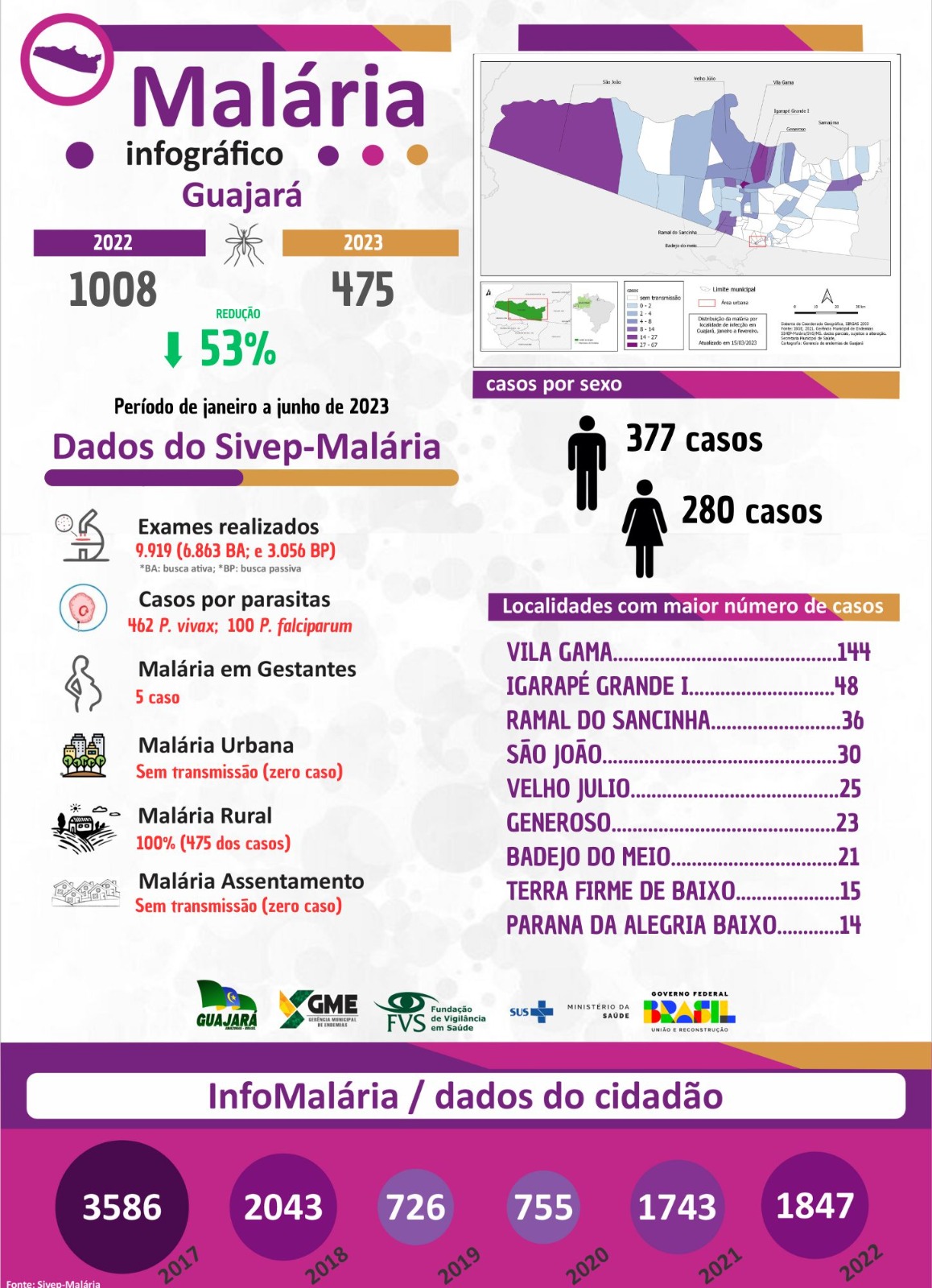 Segundo o Relatório de Publicidade: Ações de Vigilância da Malária e Dengue em Guajará, do dia 5 de julho, houve redução de 53% nos casos de malária em comparação ao mesmo período do ano anterior.