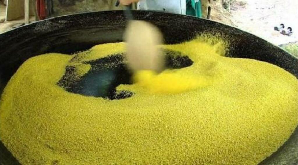 Do lado de dentro da casa de farinha, a mandioca passa pela primeira trituração, é prensada para a retirada da manipueira (líquido tóxico presente na raiz), é triturada novamente, peneirada, torrada no forno, peneirada pela segunda vez e, finalmente, levada para a secagem. Todo o processo leva, em média, mais de 30 horas.