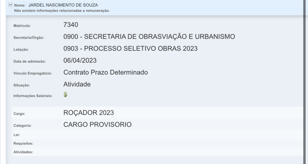 No portal de transparência da prefeitura se confirma que o servidor J. N. de S., ocupa o cargo de roçador provisório, sendo admitido no dia 06/04/2023. Nas imagens é possível ver o funcionário de costas, com camisa preta e bota realizando serviços no local.