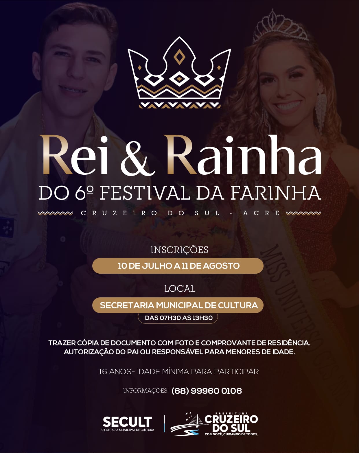 Nesta segunda-feira, 10, foram abertas as inscrições para o concurso de rei e rainha do 6º Festival da Farinha de Cruzeiro do Sul, que se encerram no dia 11 de agosto, para jovens a partir de 16 anos, residentes na cidade há pelo menos cinco anos.
