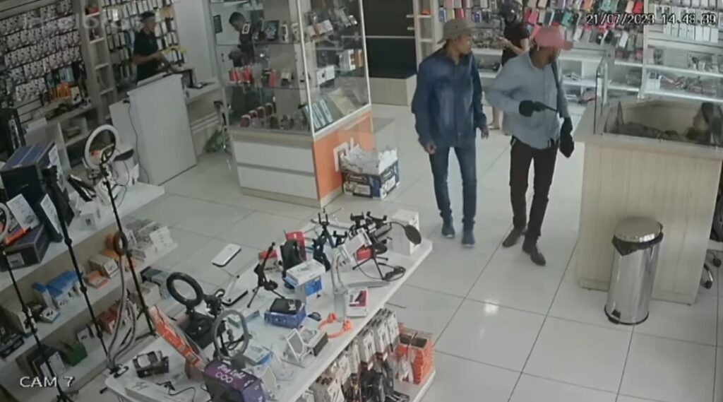 Em imagens gravadas por câmeras de segurança, é possível observar os assaltantes entrando na loja com uma mochila e apontando a arma para os clientes e funcionários, obrigando-os a se abaixarem, enquanto recolhem itens da loja e dinheiro.